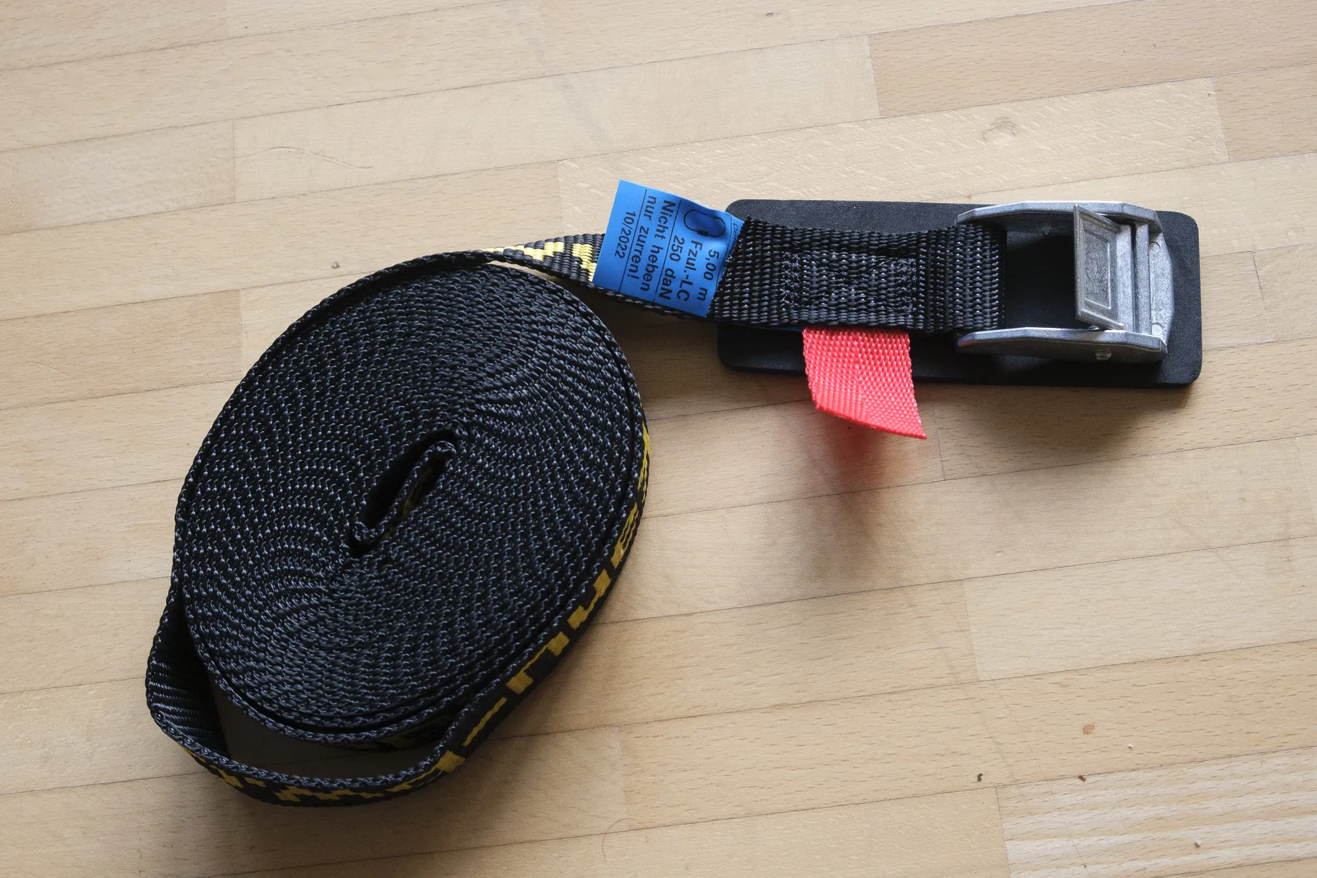 Die Gurte sind der Länge nach farblich codiert. Unter der Schnalle ist ein robustes Material vernäht, das Beschädigungen am Lack verhindert.
