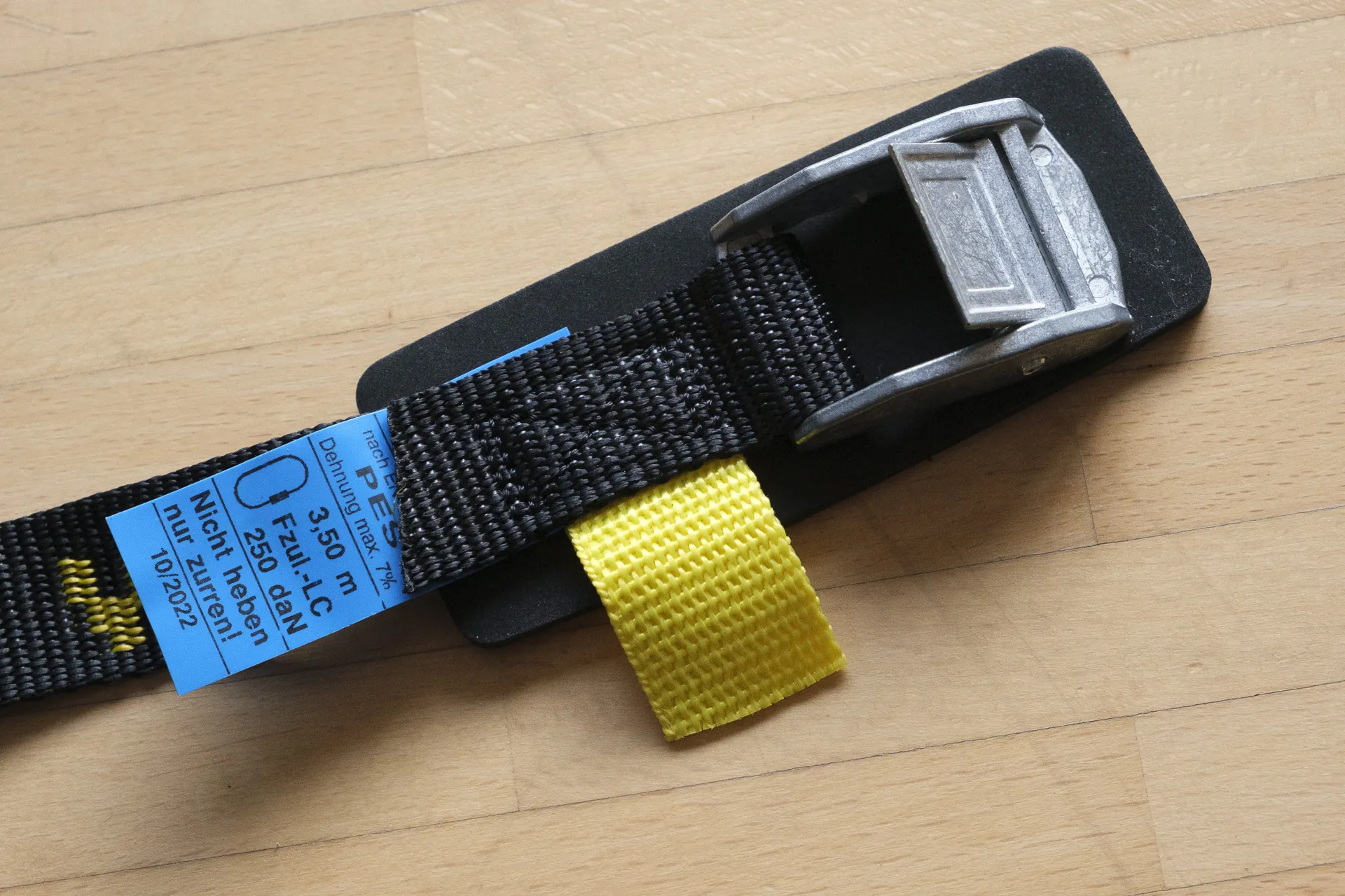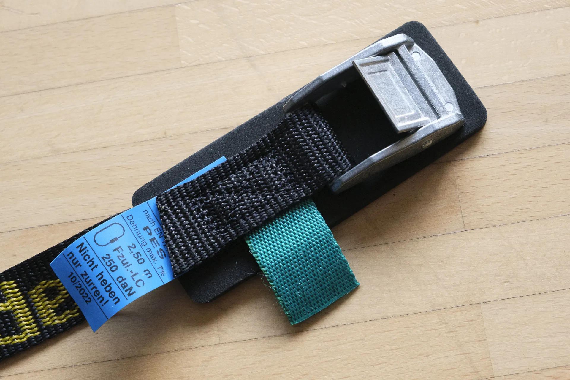 Auch die Klemmschnalle eines Gurtes kann im Extremfall versagen. Deshalb sollten stets mehrere Gurte verwendet und unter jeder Schnalle Sicherungsschlaufen gelegt werden.